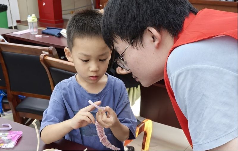 此外,志愿者们还专门安排时间辅导小朋友写作业。活动室内,孩子们拿出暑假作业,志愿者们分组耐心地为他们答疑解惑,从数学题的解题思路到语文课文的理解,细致入微的讲解让孩子们茅塞顿开。遇到难题时,志愿者们会用有趣的例子引导孩子思考,氛围轻松又高效,不少孩子表示:“志愿者哥哥姐姐讲题比我自己琢磨容易多啦!”