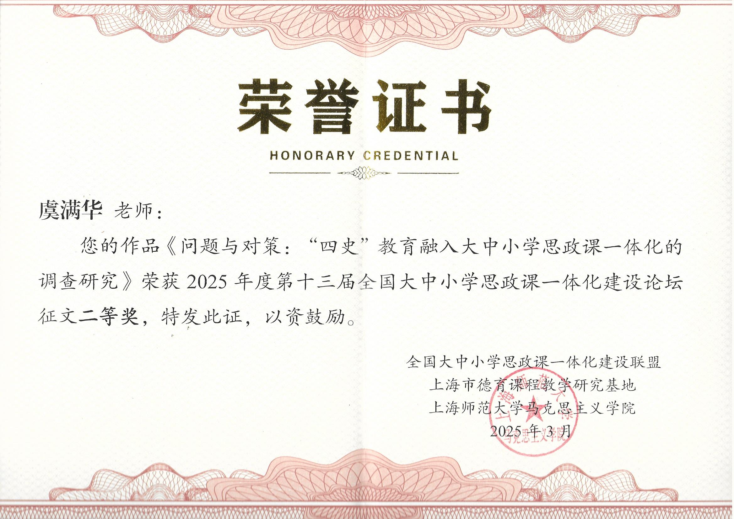 为认真学习贯彻习近平新时代中国特色社会主义思想和党的二十大、二十届三中全会精神,纪念习近平总书记“3·18”重要讲话发表六周年,共同推进大中小学思政课一体化改革创新,更好地发挥思政课在立德树人中的关键课程作用,全国大中小学思政课一体化建设联盟、上海市德育课程教育研究基地、上海师范大学联合主办的第十三届大中小学思政课一体化建设高层论坛,于2025 年 3 月14-16日在上海师范大学召开。我院教师虞满华教授受邀参会。