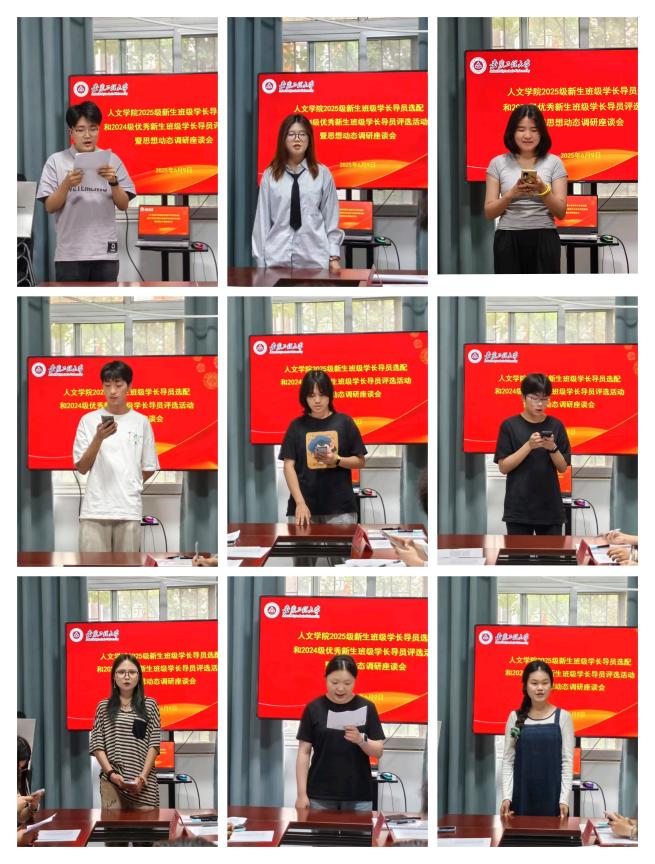 为发挥优秀大学生在新生教育管理工作中的作用,推进学校“一站式”学生社区综合管理模式建设高质量发展,6月9日,人文学院在“文”暖人馨青年服务中心暨“青年之家”学生会服务站开展2025级新生班级学长导员选配和2024级优秀新生班级学长导员评选活动暨思想动态调研座谈会。人文学院党委副书记余本祺,团委副书记利昕云,辅导员范夏勋,2024级新生班级学长导员代表,学生会主席团成员担任评委。