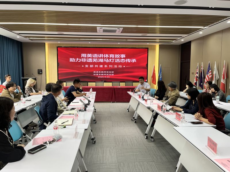 4月23日下午,在9教209会议室,外国语学院英语系教师党支部与体育学院体育系教师党支部联合开展党支部共建活动。本次活动以“用英语讲体育故事,助力非遗芜湖马灯活态传承”为主题,旨在通过跨学科合作,探索地方特色文化的国际传播新路径,推动非遗文化的创造性转化与创新性发展。