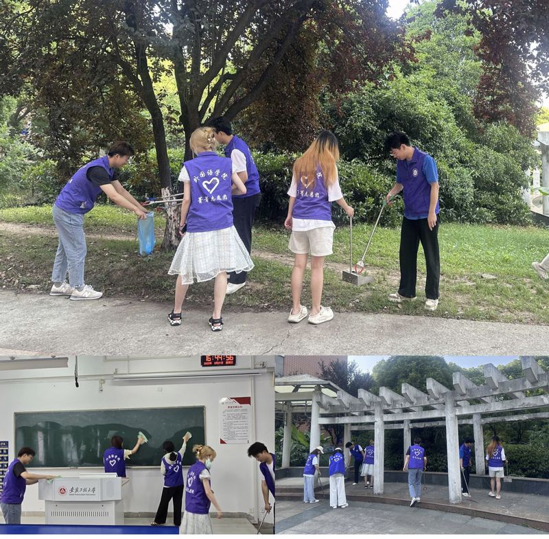 学员身着志愿服务马甲在外国语学院教学楼及5教、6教区域展开行动。清洁组手持抹布、水桶,细致擦拭教室黑板,清理粉笔槽积灰,确保教学环境整洁;整理组逐一检查讲台,规整教学用具、擦拭多媒体设备,为师生营造舒心授课空间;环境维护组携带垃圾夹与环保袋,沿教学楼周边绿化带、走廊及楼梯间捡拾散落垃圾,并进行分类投放。活动过程中,“紫阳花”团队志愿者现场示范高效清洁技能,分享户外劳动者坚守岗位的感人故事,让学员在劳动中感悟平凡岗位的不凡价值。劳动实践结束后,学员们畅谈对“劳动精神”的理解,发展对象潘书琪表示:“擦拭黑板时,我想到教师日复一日的耕耘;整理讲台时,更体会到‘三尺讲台系国运’的责任感。我们既要学好专业知识,更要用双手服务他人、回馈社会。”
